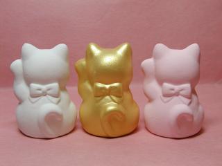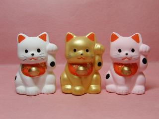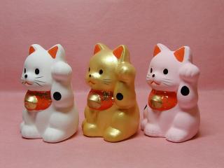 トリオ招き猫さん ごくごくシンプルな型押しの招き猫さんですが、とってもキュ〜ト。 お店では、ちょうど仕入れたばかりだったのか沢山の同じネコさんが 飾られていました。こうなると、どのネコさんを連れて帰るか、すっごく迷うんです。 こういうネコさんって、ぜ〜んぶお顔付きが違うから、1つ1つみ〜んな見ないといけない(^^ゞ その沢山のネコさんから選ばれた子達です。如何でしょう?(*^m^*)