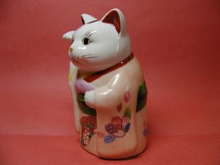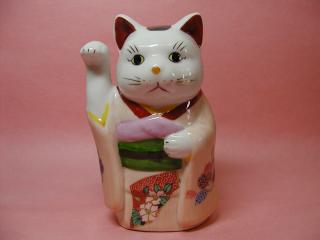 着物姿招き猫さん 着物姿が艶やかな瀬戸の招き猫さん。 お着物の椿も鮮やかです。 ちょっとすっとぼけたようなお顔はご愛敬(*^m^*)