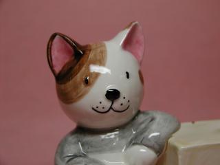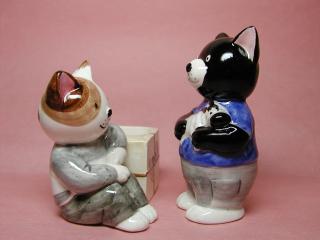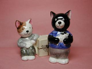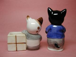 キュベ・ブ〜ブ・シス ちょっとクマさんかワンちゃんぽいお顔ですが、れっきとしたネコさんです。 キュベ・ブ〜ブ・シスと言うシリ〜ズのタッシュ君とノワ〜ル君。 この他に、ミシェル、ブル〜、メ、グリのネコさんがいます。 本当はスパイス入れですが、我が家ではお飾りネコさんとして飾ってあります。