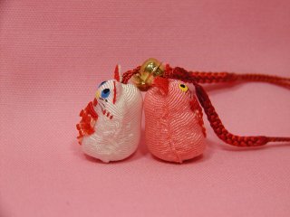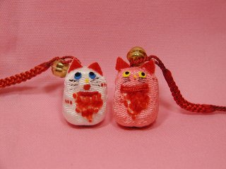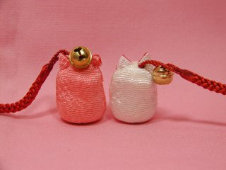 ちりめんで出来た小さい小さいネコさんのストラップ。