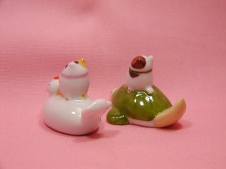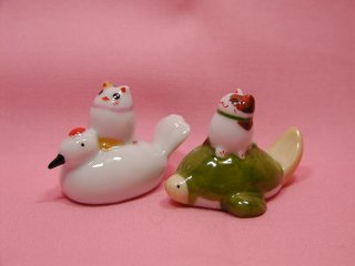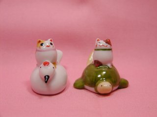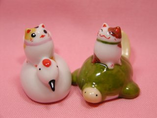 おめでたい鶴と亀に乗った小さなねこさんたち。