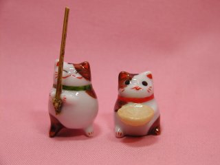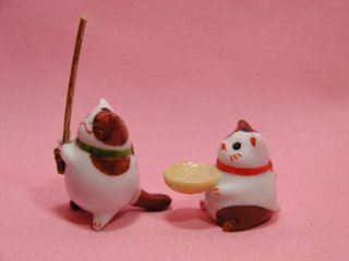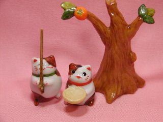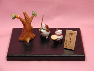 猫舎ジオラマ・柿とり 四季を通じて様々なシチュエーションがある猫舎のジオラマ。 棒を持って柿を落とそうとするねこさんと、ざるを持って待ちかまえるねこさんの秋の柿とり。 何だか秋の夕暮れって感じ。。。ほのぼのしますねぇ〜(^_^)