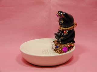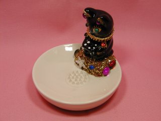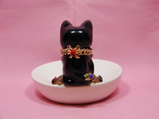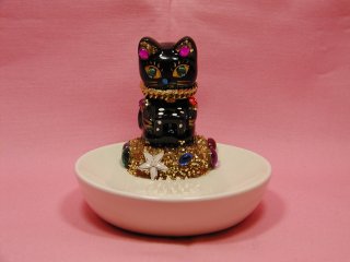 ゴージャスねこさん キラキラアクセサリーを付けたねこさんのお線香置き。 本来は良い香りのする三角のお線香を置くものですが、 うちでは、アクセサリー入れとして使っています。