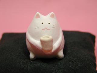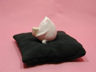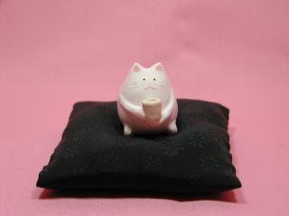 「石川恵子さん」のネコさん 2002年10月、東京谷中の猫町で開催された「猫の明かりと香り展」 から連れ帰ったネコさんです。 おざぶの中にロ〜ズの香りのポプリが入っています。