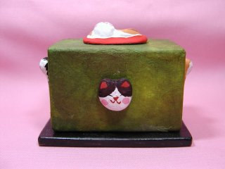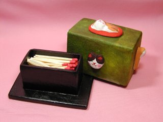 「戸村裕さん」のネコさん 2002年11月に東京谷中の「猫町さん」で開催された 「猫の創作マッチラベル展」から連れ帰ったネコさんです。 綺麗な緑色のマッチ入れ。ネコさん、猫手もかわいい(o^^o) 『桐塑の上に県内産の烏山和紙(別名程村紙)の染紙を 紙装したものであります』(ねこぢゃらさん)