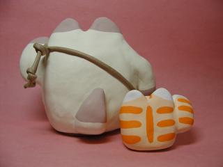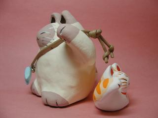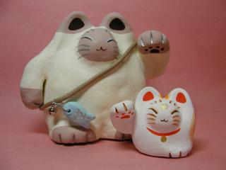「恵璃」さんの招き猫さん とっても個性的なネコさんを作っていらしゃる恵璃さんの招き猫さんです。 大きい方の招き猫さんは「ひまらやん」と言うお名前。 何だか楽しげな表情と、ずんぐりむっくりの身体が、見ている方も楽しくしてくれそう。 大きめの手と足も力強くって良いです。頼れる招き猫さんって感じでしょうか。 恵璃さんのサイト「ERIUM」には、招き猫さんの他に、かわいい猫雑貨もあります。