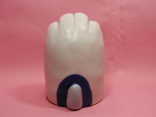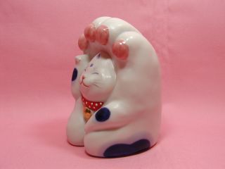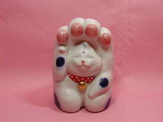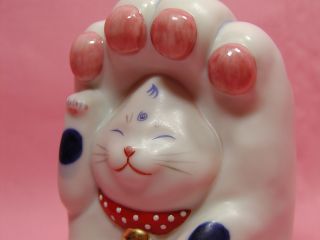 「もりわじんさん」のネコさん 何とも個性的な猫手につつまれた招き猫さん。 観音様のようなお姿で、いかにもご利益ありそう。 後ろ姿は。。。(=^m^=)