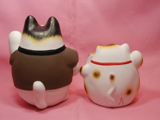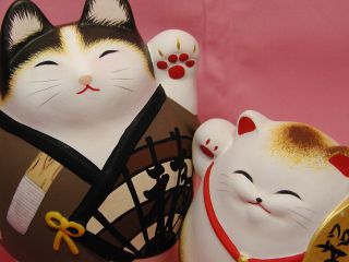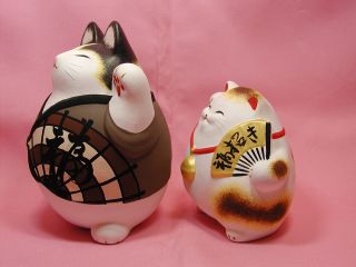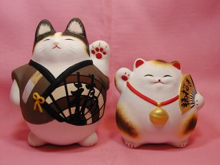 「彦次郎さん」のネコさん 大分県にある日子里(にっこり)工房の彦次郎さんの招き猫さんです。 ぷくぷくとした体つきがかわいい福半纏招猫さんと扇福招き猫さん。