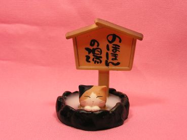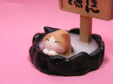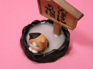 「ねこどんさん」のネコさん 2003年9月に府中伊勢丹で開催された「第1回ねこ展」から 連れ帰った樹脂作家ねこどんさんの温泉にゃんこ。 ほわわぁ〜んとした湯気が見えてきそう(=^m^=)