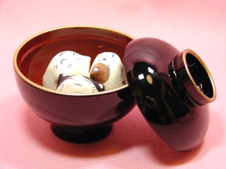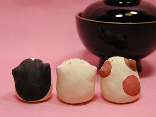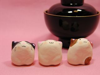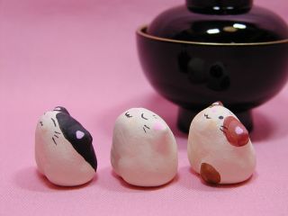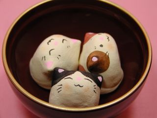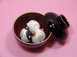 「松風直美さん」のネコさん 2003年12月に東京谷中「猫町」で開催された 「猫のちいさなおくりものかざりもの展」から連れ帰ったネコさんです。 小さなお椀の中にはかわいいネコさん達。題して「猫白玉」。 かわいすぎるぅ〜(≧∇≦)