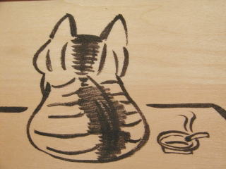 「中山真依子さん」のネコさん 2004年2月、東京高円寺「猫の額」で開催された「犬vs猫展」から連れ帰ったネコさんです。 哀愁を帯びた後ろ姿(=^m^=)と、吸いかけのタバコ。。。 このシチュエーションが一目で気に入っちゃいました(o^^o)
