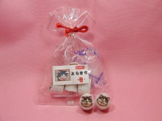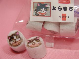 「草田美津保さん」のネコさん あまりにもかわいいのでご紹介(=^m^=) 「とら吉金太郎飴」です。牙も鼻くそもちゃーんとあります。 ほんのりした甘さで美味しいです。