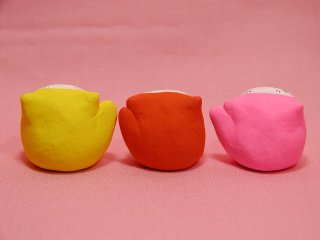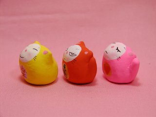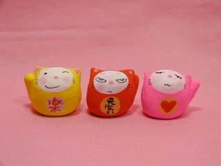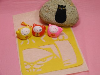 「松風直美さん」のネコさん 2004年5月に滋賀県彦根で開催された「ヘムスロイド村祭り」から 連れ帰ったネコさんです。 私の大好きな豆ねこさんたちと、猫石、福まねき剪紙。