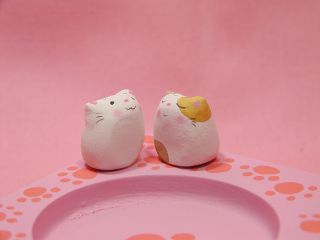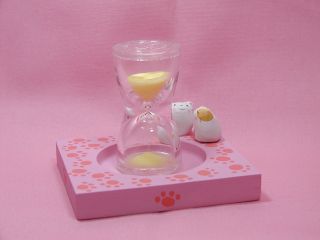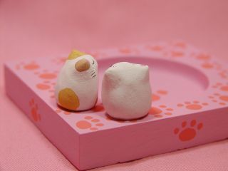「松風直美さん」のネコさん 2004年6月に東京谷中「猫町」で開催された「猫の時計屋さん」から 連れ帰ったネコさんです。 ネコさんをモチーフにした置き時計、掛け時計、腕時計などなど、 かわいかったり、オシャレだったりする沢山のネコさん時計が並ぶ中。。。 すぅ〜っと落ちる砂を見つめるネコさん。おお〜っ!砂時計っ!さすが、ねこてさんっ! これからは、この子たちにカップラーメンの番をして貰います(=^m^=) って。。。普通はお洒落に紅茶ですよね(^^ゞ