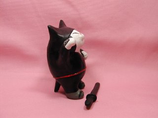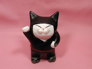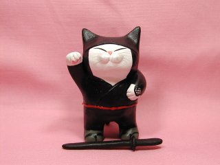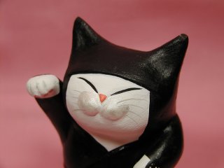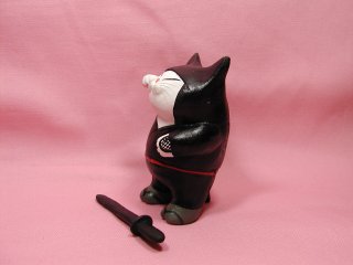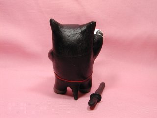 「あべ夏子さん 」のネコさん 2004年9月に東京谷中「猫町」で開催されたあべ夏子さんの個展 「QUE SERA SERA(ケ・セラ・セラ)」から連れ帰ったネコさんです。 黒装束に身を包んだ忍者ネコさん。 身の軽い猫さんなら、どこにでも忍び込める優秀なシノビになれる?(=^m^=)