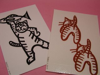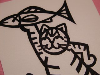 「紋次郎きりえ本舗さん」のネコさん 2004年10月に東京新宿パークタワーで開催された 「クラフト・アート・マーケット」から連れ帰ったネコさんです。 社長猫さん紋次郎くんの指示のもと(=^m^=)の切り絵のネコさん。 のびのびとした感じがグゥ〜(*^^)v