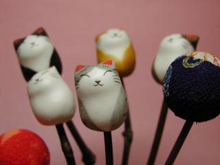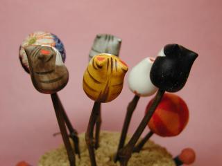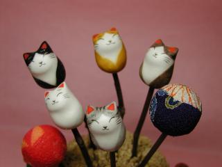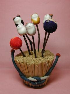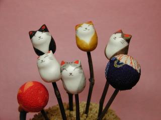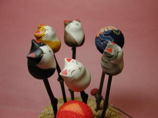 「ぴ〜さん」のネコさん 2001年最後の最後、大晦日に立川で開催された招き猫展で出会った ぴ〜さんこと松本浩子さんの串人形だるまネコさんです。 私の大好きなだるまネコさんがいっぱ〜い(o^^o) あっ、あれっ!?三毛ちゃんがいないぢゃ〜ん(^^ゞあちゃ〜。