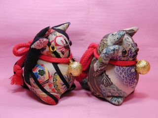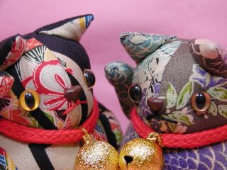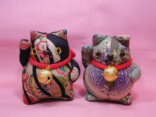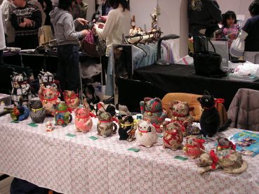 「萩工房さん」のネコさん 2005年1月、横浜赤レンガ倉庫で開催された「第3回あ〜てぃすとまーけっと」 から連れ帰った招き猫さんです。 鮮やかな布製の手作り招き猫さん。 胴回りのまるまる感が、と〜っても福々しくて大のお気に入りですσ(^^)
