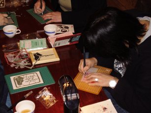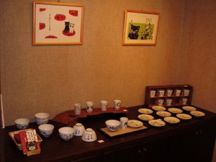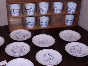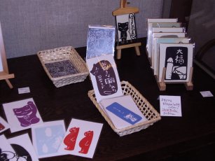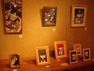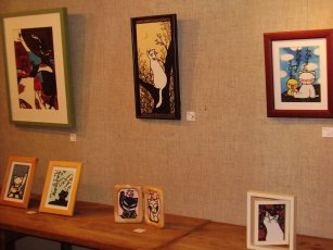 どれもかわいい&素敵なネコさん切り絵の数々。 ネコさんと共に元気になる言葉が描かれたお茶碗や湯飲み、お皿などなど。 個展の様子。その場で好きな文字も入れて貰えます。