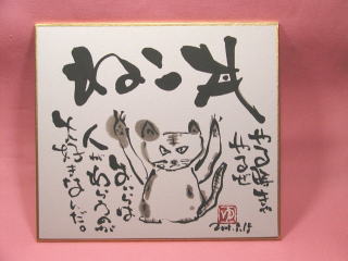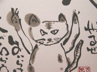 「やすだゆみさん」のネコさん 2005年5月に開催された「第4回ア〜トム〜チョin八王子」から 連れ帰ったねこさんです。 「筆字屋」のやすだゆみさんのブースはいつもお客さんでいっぱい。 開店時間前に無理言って(すみません〜)ねこさん書いて貰いました(^^ゞ お客さんの目を見て、その場で言葉を思い浮かべて字にしていく。。。 ねこ丼のお言葉はこうなりました(=^m^=)