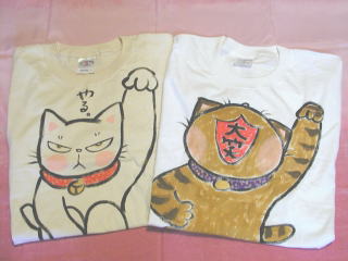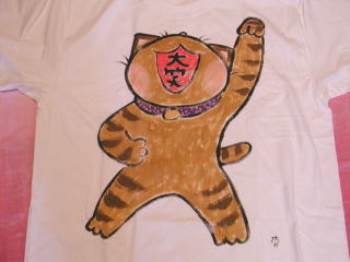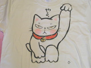 「松風直美さん」のネコさん 2005年5月に滋賀県東近江市ことうヘムスロイド村で開催された 「ART GALLERY ヘムスロイド2005」から連れ帰ったねこさんのTシャツです。 キリッっとしたお顔で決意(?)の「やる。」、仁王立ちで大笑いのねこさん。 どちらもぜ〜ったい福を招いてくれそう(=^m^=) ねこてさんこと松風さんワールド満載のねこさんたちです。