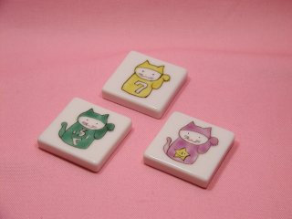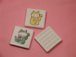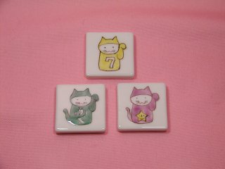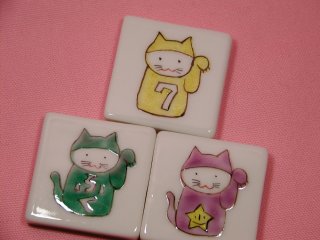 「東早苗さん」のネコさん 2005年5月に東京谷中「ギャラリー猫町」で開催された 「猫のアートタイル展」から連れ帰ったねこさんです。 シックなねこさんからかわいいねこさんまで、タイルに描かれた様々な作家さんの ねこさんが並んでいました。その中からこのねこさんたちをゲット。 0〜9までの数字と、いくつかのワンポイントのついたねこさんがいました。