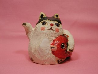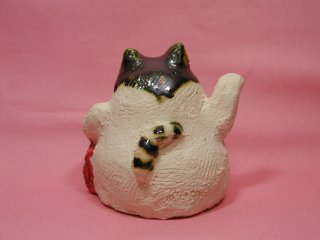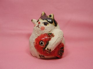 「小室幸雄さん」のネコさん 2005年7月に東京谷中、ギャラリー猫町で開催された 「でぶねこ展」から連れ帰ったねこさんです。 「アイクルシイ?アツクルシイ?愛嬌たっぷりのでぶねこがいっぱい!」を コンセプトに開催された「でぶねこ展」。プクプクコロコロのねこさんたちが勢揃いでした。 その中から、色白プクプクの真っ赤な鯛(?)を抱えたねこさんを連れ帰りました。 後ろ姿も愛嬌たっぷり(=^m^=)