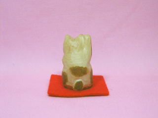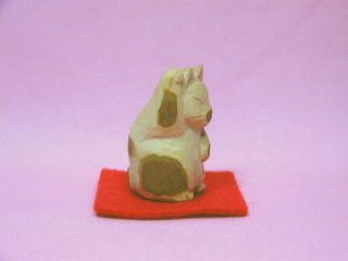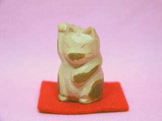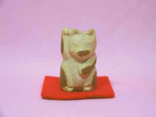「千早さん」のネコさん 2005年8月に愛知県瀬戸市で開催された「招き猫まつり」から連れ帰ったねこさんです。 招き猫さんをこよなく愛する日本招猫倶楽部会員による招き猫楽市。 木から削り出された招き猫さんです。木目をうまく模様にしている斑猫風。 お顔のおひげ模様が良い感じ。