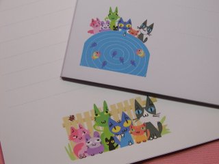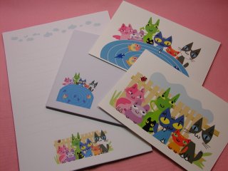 「岩井村」さんのネコさん 2006年1月に東京高円寺の猫ギャラリー「猫の額」で開催された 岩井村さんの個展「猫ともだち展」から連れ帰ったねこさんです。 ユニークなねこさん達が集まったイラストが描かれたレターセット。 便せん、封筒、ポストカード、メッセージカードなど盛りだくさんです。
