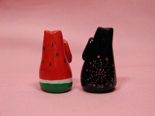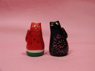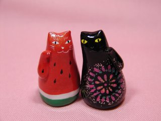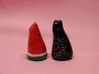 「櫻井魔巳子」さんのネコさん 2006年6月に東京谷中「猫町」で開催された「夏猫雑貨展」から連れ帰ったねこさんです。 夏猫ということで、スイカと花火仕様の招き猫さん。 花火の絵付けは色鮮やかで繊細でとっても綺麗。スイカも美味しそう?(=^m^=)