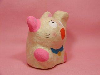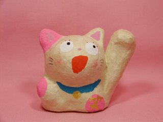 「松風直美」さんのネコさん 2006年9月に開催された「第11回来る福招き猫まつりin瀬戸」。 瀬戸の文化センターで開催された「平成の招き猫100人展アートマーケット」から 連れ帰ったねこてさんこと松風直美さんのネコさんです。 和紙張りの招き猫さん。ピンクぶちの明るく元気な感じのネコさんです(*^^)v