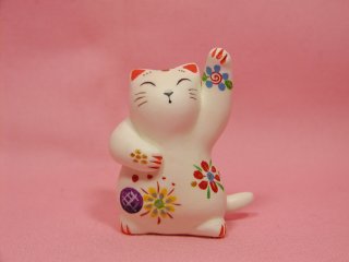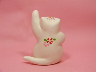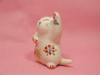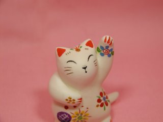 「松本浩子」さんのネコさん 2006年9月に伊勢で開催された「来る福招き猫まつり」の「招き猫現代作家展」から 連れ帰ったねこさんです。 お花の絵付けがすっごく綺麗な白猫の招き猫さん。 楽しそうなお顔付きもめちゃめちゃかわいいです。