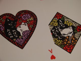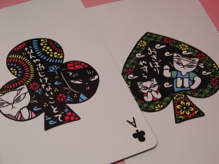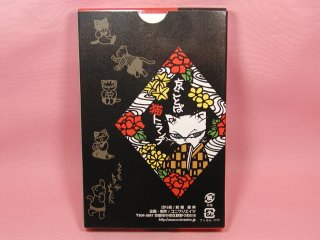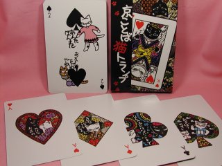 「松風直美」さんのネコさん 2006年11月に東京・谷中にある「ギャラリー猫町」で開催された 「ねこかるた・ねここよみ展」から連れ帰ったねこさんです。 ねこてさんこと松風直美さんの「京ことば猫トランプ」。はがきサイズの大きなトランプです。 一枚一枚に素敵なねこさんと京ことばが描かれています。 全部を並べて飾っておきたい感じ(=^m^=)