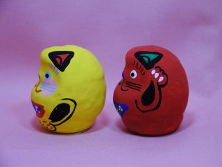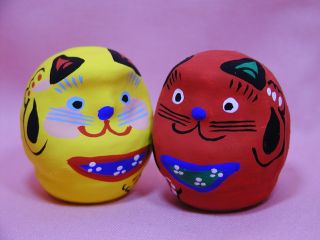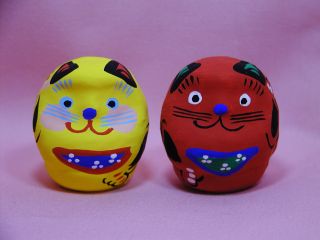 「春日部張り子」さんのネコさん 鮮やかな絵付けの招き猫さんで有名な春日部張り子さん。 縁起の良いダルマさんが招き猫さんになっています。