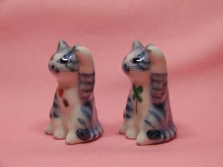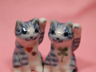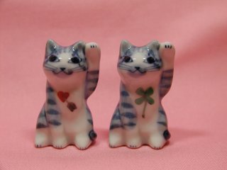 「東早苗さん」さんのネコさん 2007年1月に東京・谷中のギャラリー猫町で開催された「創作招き猫展」から 連れ帰ったねこさんです。 矢の刺さったハートと四つ葉のクローバーが描かれたとら猫の招き猫さん。