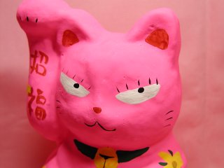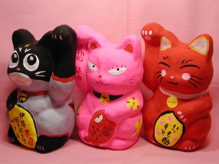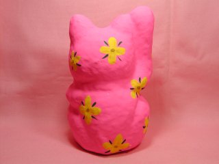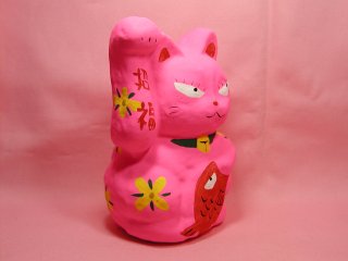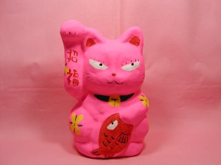 「松風直美」さんのネコさん 2007年9月に三重県伊勢で開催された「来る福招き猫まつり」の絵付け体験の招き猫さん。 ねこ丼が大好きな松風直美さんが伊勢の招き猫まつりで絵付けした招き猫さんです。 全身ピンクで悪顔(=^m^=)持ってる鯛まで悪顔(≧∇≦) 。。。で、お花柄。めっちゃ存在感あります。 もとは同じ真っ白の招き猫さんなのに、絵付けで個性的な招き猫さんに。