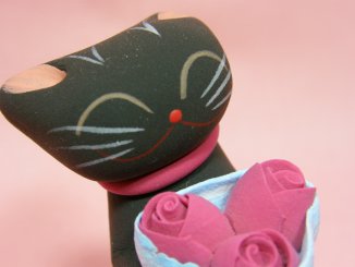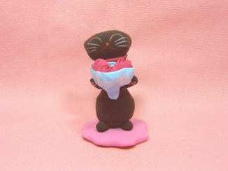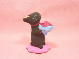 「前川道子」さんのネコさん 2008年9月に東京・渋谷東急東横店で開催された「渋谷猫通り商店街22番地・ねこのクラフトと雑貨展」から 連れ帰った「花ねこ」さんこと前川道子さんのねこさんです。バラの花束を持った花ねこさんの黒猫さん。 黒猫さんながらほんわかした感じ。