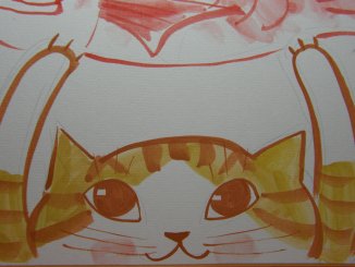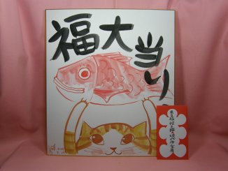 「東早苗」さんのネコさん 2008年9月に三重県伊勢で開催された「招き猫まつり」から連れ帰った さなぼさんこと東早苗さんの色紙です。 おかげ横町内にある大黒ホールで開催された「招き猫現代作家展」のくじ引き企画。 大きな鯛を持ち上げた茶トラのねこさん。めでたいっ!