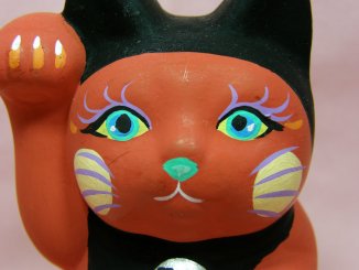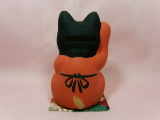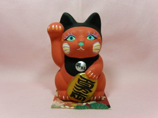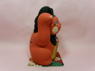 「安江美佳」さんのネコさん 2008年9月に愛知県瀬戸で開催された「来る福招き猫まつり」から連れ帰ったねこさんです。 安江さんの地元、岐阜のさるぼぼの招き猫さんバージョン。