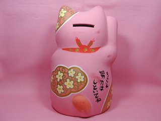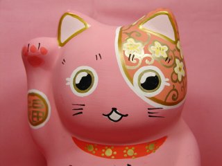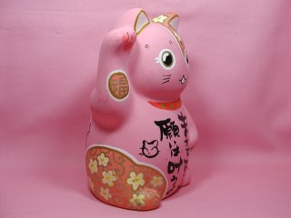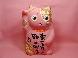 「荒木淳子」さんのネコさん瀬戸の招き猫まつりから連れ帰った招き猫さんです。 いい感じのピンクのボディ〜にお花柄。おちょぼ口のかわいいお顔。力強いお言葉。 沢山並んでいる招き猫さんたちの中からこの子だっ!と思い連れ帰りました(=^m^=)