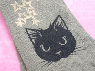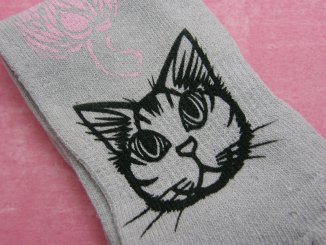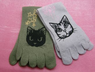 「さとうみよ」さんのネコさん 東京・高円寺の猫ギャラリー「猫の額」で開催された「はちわれ展」から連れ帰った ねこさんの顔がプリントされた5本指靴下です。男性用(左)と女性用(右)