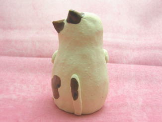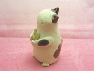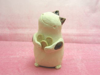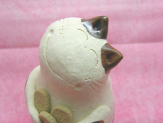 「藤田三恵子」さんのネコさん 2009年8月に横浜赤レンガ倉庫で開催された「第11回あ〜てぃすとマーケット」から 連れ帰ったねこさんです。「陶房のら」の藤田三恵子さんのねこさん。 にこやかなお顔付き。お顔の傾け具合が絶妙です(=^m^=)