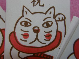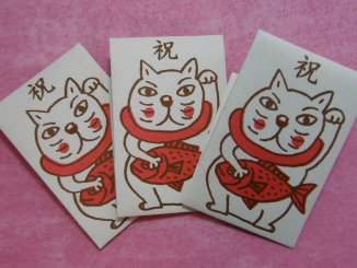 「高原鉄男」さんのネコさん 2009年11月に東京谷中、ギャラリー猫町で開催された高原鉄男さんの個展「100CATS、100LIVES」 から連れ帰ったねこさんのポチ袋。意志の強そうなお顔の招き猫さん。
