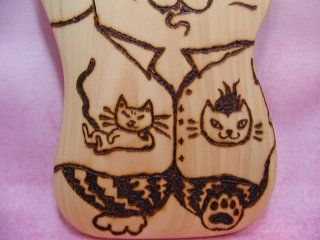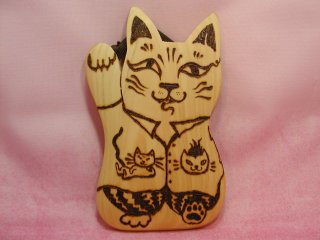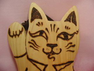 「しまこう」さんのネコさん カービングアーティストしまこうさんの招き猫さん。 飛騨高山の桜の木を削り磨いた招き猫さんにカービング。 なかなか個性的です(=^m^=)