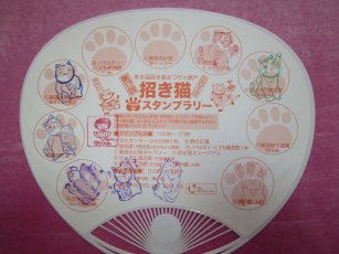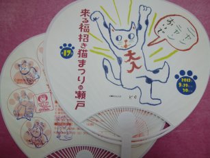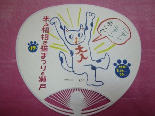 「黒田征太郎」さんのネコさん 2012年9月に愛知県瀬戸で開催された「来る福招き猫まつり」から連れ帰ったねこさん。 招き猫スタンプラリーの台紙うちわです。