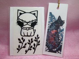 「松風直美」さんのネコさん 2014年6月に東京、千駄木の「ギャラリー猫町」で開催された 松風直美さんの個展「Chat et fleur」から連れ帰ったねこさん。 カッティングシートのねこさんと、しおり。