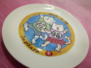 「杉原京」さんのネコさん 2017年9月に愛知県瀬戸で開催された「来る福招き猫まつり」から連れ帰ったねこさん。 2016年日本招き猫大賞受賞の杉原京さんのスタンプラリーうちわと瀬戸焼そばのお皿です。