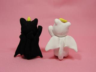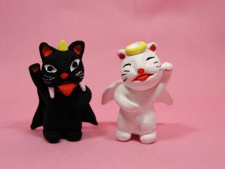 「夜猫さん」のネコさん 謎のなんちゃって猫作家、夜猫さんのネコさんです。 悪魔くんと天使ちゃん。如何ですか?(=^m^=)