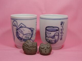 「松風直美さん」のネコさん 2002年6月に「ギャラリ〜猫町」さんで開催された器展から 連れ帰ったお湯のみと箸置きのネコさんです。 ご飯の後、旦那さんと飲むお茶がより一層美味しくなりそう(=^m^=) にひひ顔と、うひょ〜顔のネコさん箸置きもお気に入り。
