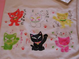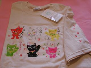 「松風直美さん」のネコさん 2002年6月「ぎゃらり〜猫町」で開催された「猫のTシャツ展」から 連れ帰った松風さんのネコさんTシャツです。 カラフルで元気なネコさん達に一目惚れ(≧∇≦)